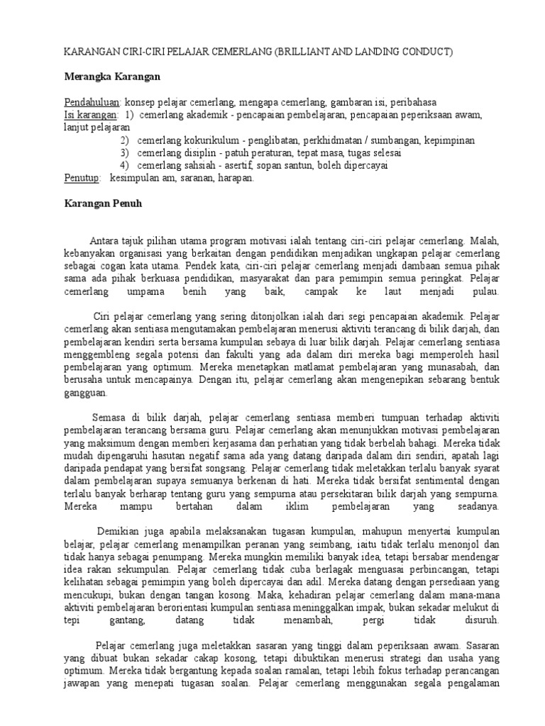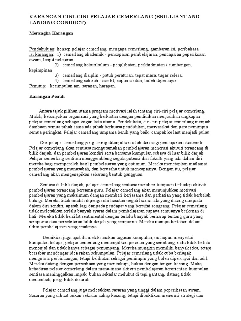 Antara ciri utama pelajar cemerlang ialah pencapaian yang memberangsangkan memberangsangkan dalam bidang akademik. Kebiasaannya murid yang berkualiti dihormati oleh orang lain dan mempunyai masa depan yang cerah. Kualiti sosial senang didamping i pelajar. Contoh menjalankan ujian minat kerjaya dan ujian personaliti. Karangan contoh 20 format ceramah :