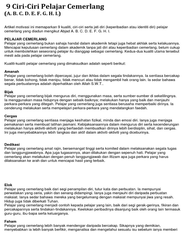 Karangan Ciri Ciri Pelajar Cemerlang - Jika pinggulnya masih padat berisi dan kencang, maka bisa dibilang jika.. Pelajar cemerlang umpama benih yang baik, kalau di campak ke darat menjadi gunung dan jika dicampak ke laut menjadi pulau. Seluruh jenis karangan tersebut dijabarkan secara mendalam satu persatu dengan runtut agar mudah dipahami dan dimengerti peserta didik. Ia sentiasa bercakap benar, tidak bohong, tidak menipu, tidak mencuri dan tidak rasuah. Berderap seiring berjalan pulang, mawar disisip hiasan si dara, remaja kini berperibadi cemerlang ciri utama yang perlu ada dalam diri seorang pelajar cemerlang ialah mempunyai sahsiah dan peribadi yang unggul. Pelajar cemerlang sentiasa memberikan tumpuan terhadap pelajaran dan proses pembelajaran di sekolah.